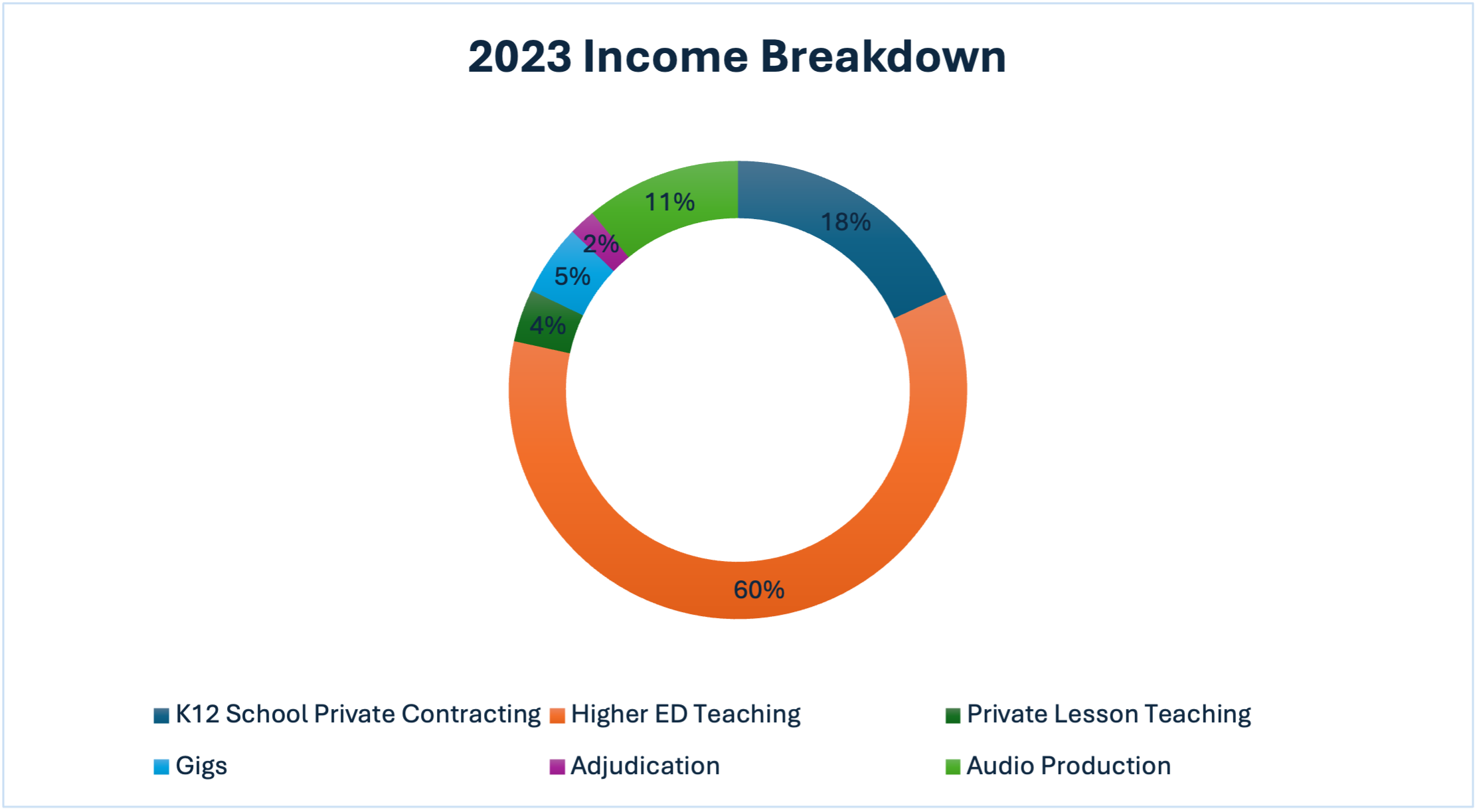 Now parts of this may be deceiving at first, so let me explain the categories. K12 contracting includes all marching band, group lessons, masterclasses, and maintenance work done for K12 schools. This calendar year, I did most of that work with one high school with a few scattered individual appearances. Higher ED teaching is rather straightforward. This includes all teaching done at high education institutions including masterclasses and group lessons. This year I taught courses at two universities and gave masterclasses at two others. Private lessons includes all private lessons taught to any age for either percussion or music production. Gigs includes all paid performances. This year I worked with two bands regularly and did plenty of one-off performances with other artists or solo. Adjudication includes my work adjudicating for marching band circuits. Audio Production and Sound Design includes all work as an audio engineer, sound designer, or performances that also included sound design or consultation work.